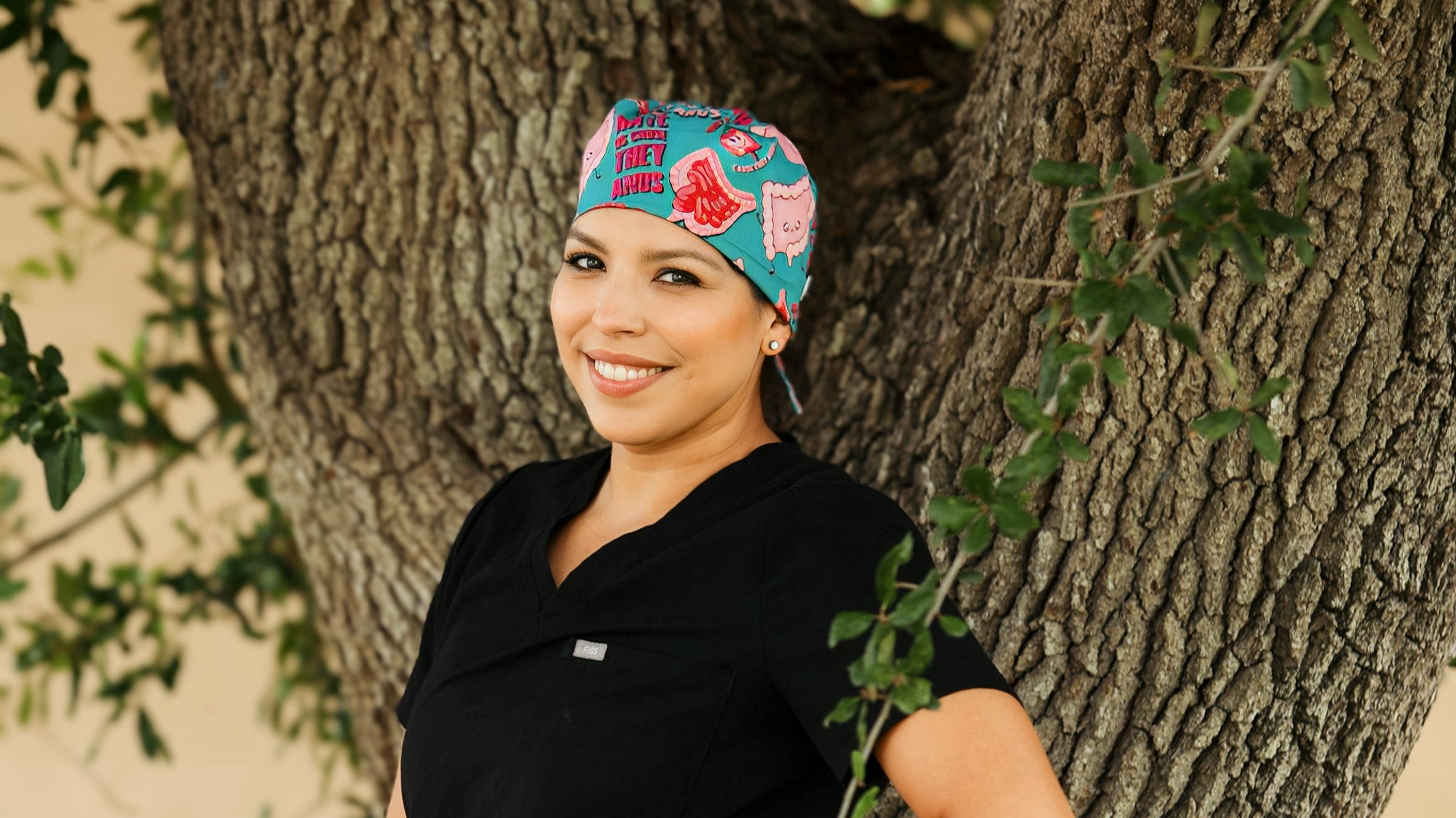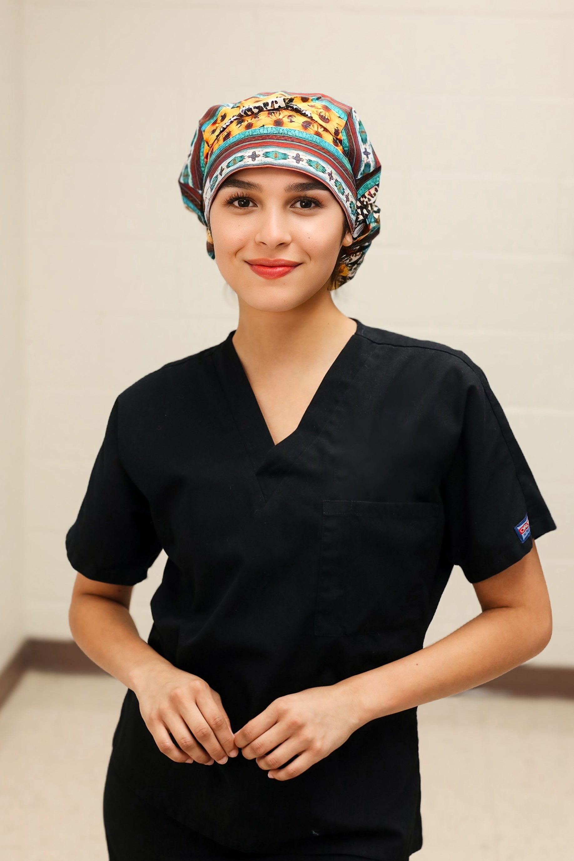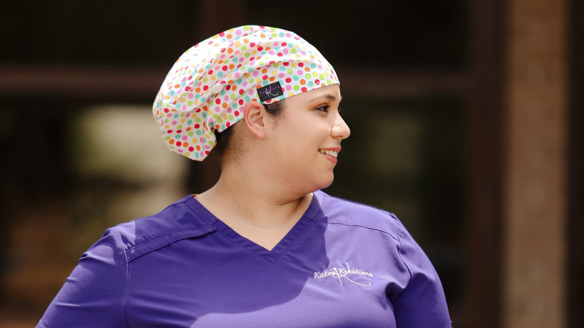 Finally, the Female Surgeon Cap style. A blend of euro and pixie styles, suitable for both males and females. Fabric ties at the back, designed to fit over a low bun or short hair.